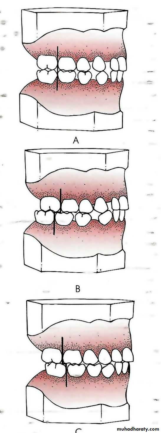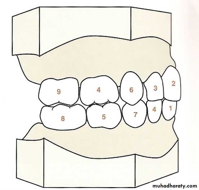 Key I – Molar relationshipMB cusp of the max 1st molar falls into the mesiobuccal groove of the mand 1st molar and that the distal surface of the DB cusp of the upper first permanent molar should make contact and occlude with mesial surface of the MB cusp of the lower second molar.