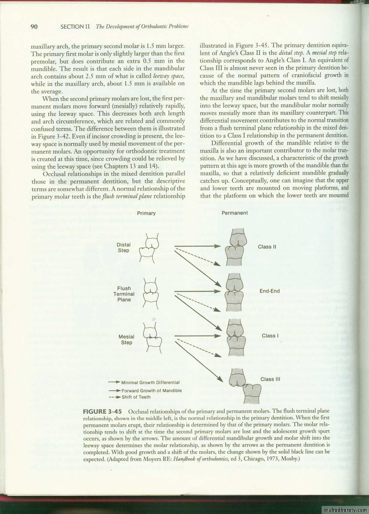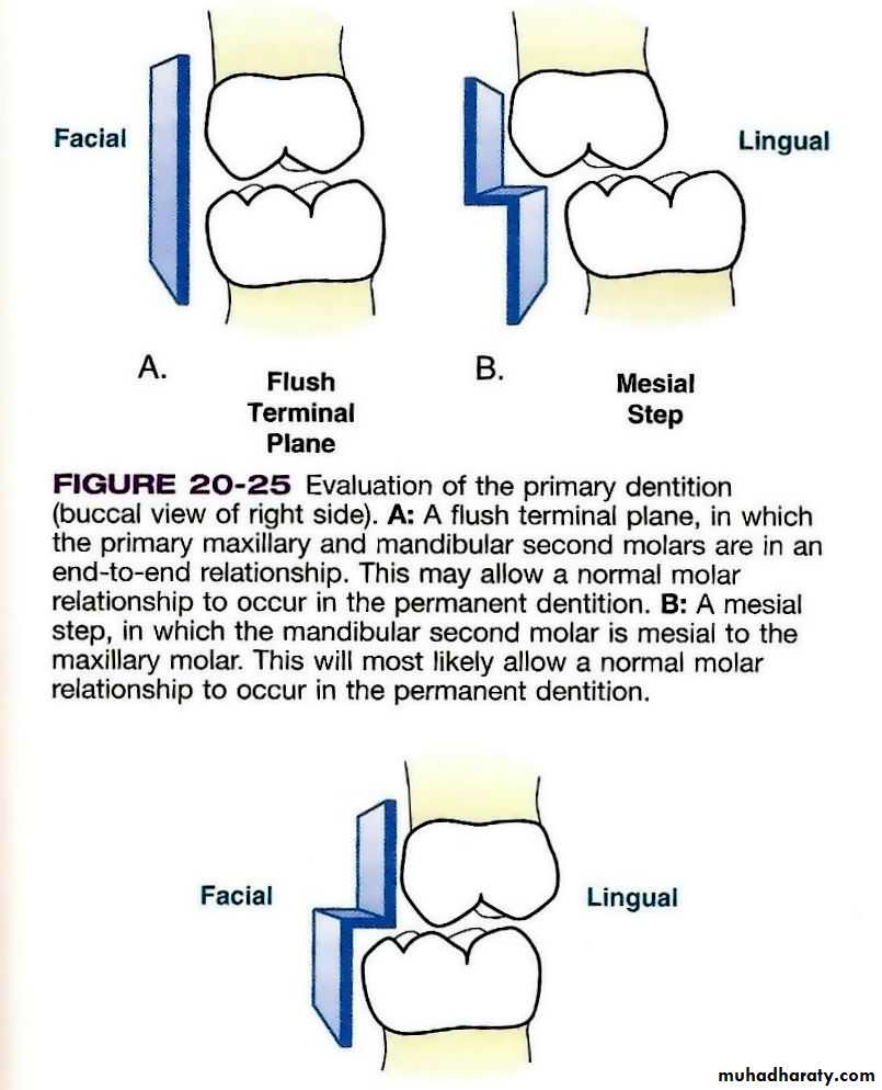 Primary second molars in mesial step relationship lead to a class I molar relation in mixed dentition. This may remain or progress to a half or full cusp class III with continued mandibular growth.Influence of terminal plane on the position of 1st permanent molar