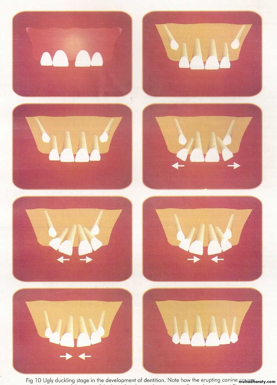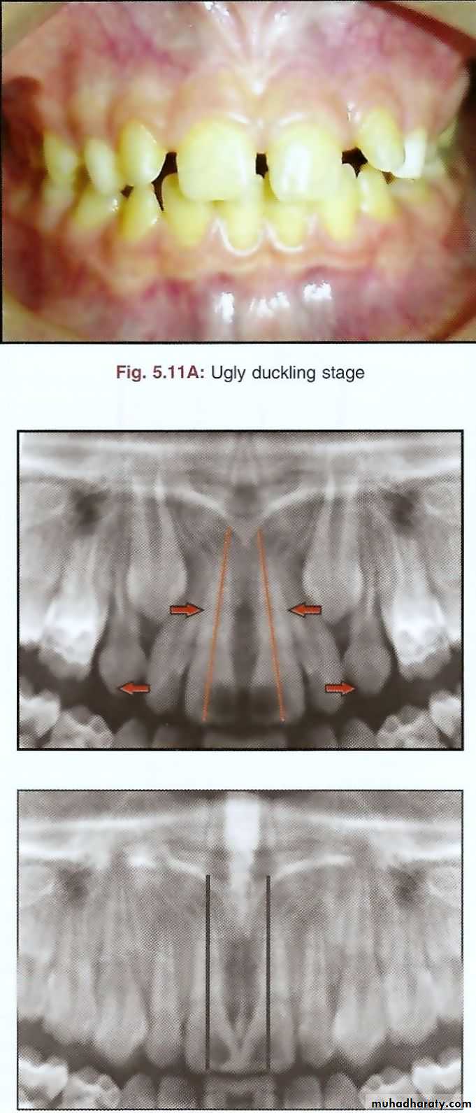 The roots of the central incisors are also forced together, thus causing a maxillary midline diastema.Ugly Duckling Stage