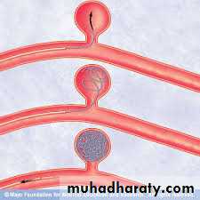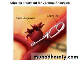 SURGICAL TREATMENT : ruptured aneurysm consists of clipping the neck of the aneurysm or the endovascular placement of a coil to induce clotting.