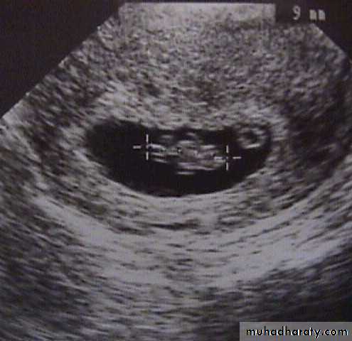 Investigations:Ultrasound :confirm intrauterine gestation (IUG) and fetal heart (FH).