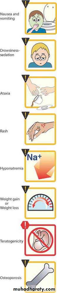 Effects on the CNS. Sedation, Nystagmus, ataxia, diplopia and cognitive impairmentGingival hyperplasia.