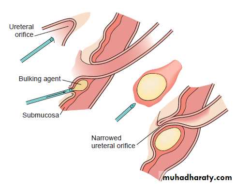 Endoscopic correction of VUR. Through a cystoscope, a needle is inserted into the submucosal plane deep to the ureteral orifice and bulking agent is injected, creating a flap-valve to preventVUR.