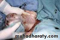 No downward or outward traction is applied to the fetus until the umbilicus has been reached.