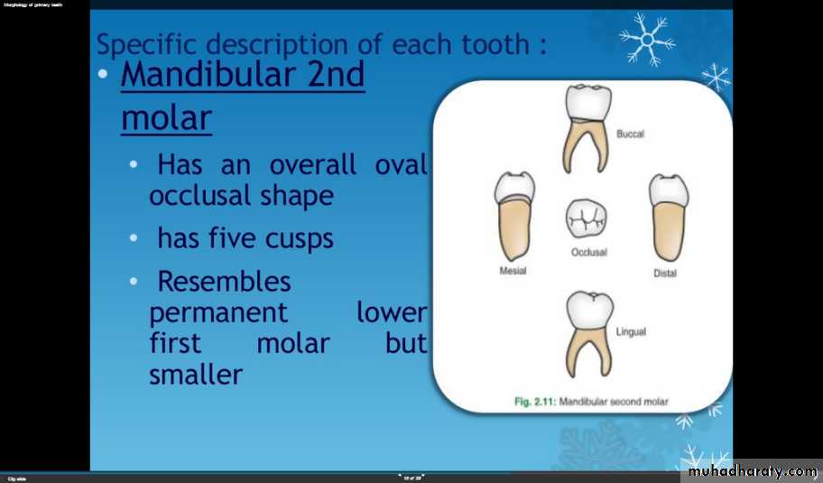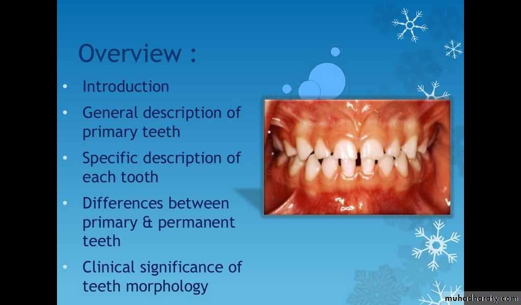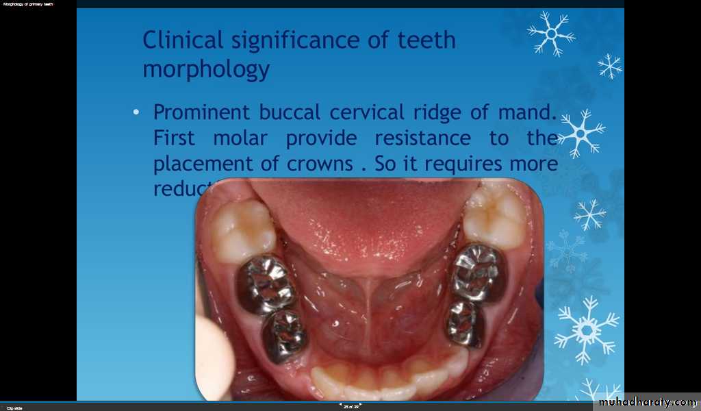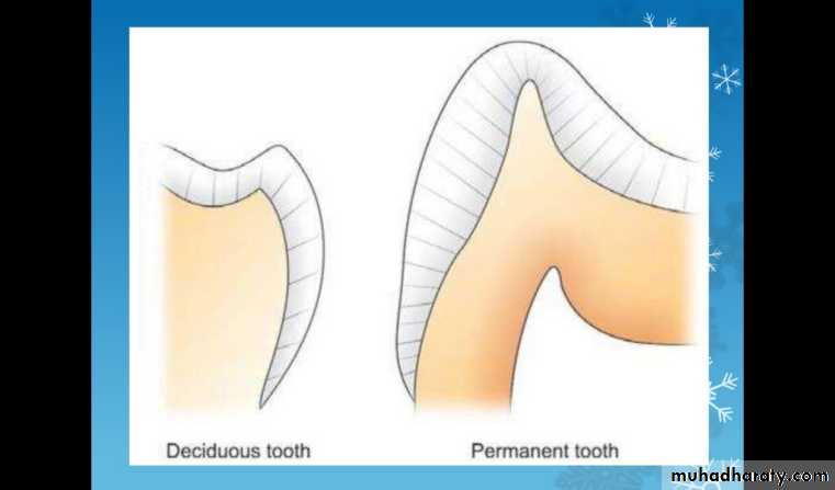 The primary teeth show marked constriction at the cervix (cervical region of the crown) and a pronounced cervical bulge particularly the buccal surfaces of he primary molars (especially the mesiobuccal cervical bulge).The enamel and dentin layers of the primary teeth are approximately equal in thickness and are generally thinner than permanent teeth.