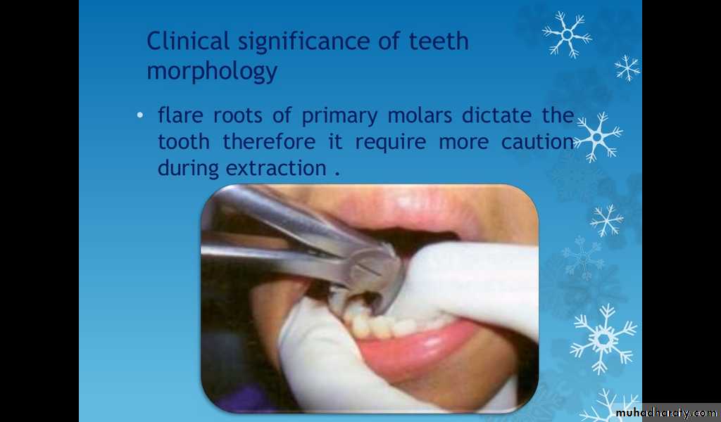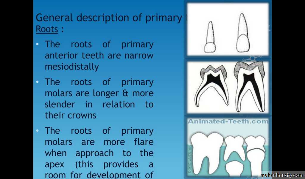 Roots of the primary molars being more delicate and divergent(flare) as they approach the apex , this to accommodate the succedaneous bicuspid , this point is very important when you extract the primary molars with unresorbed roots(care should be taken to the permanent successor).