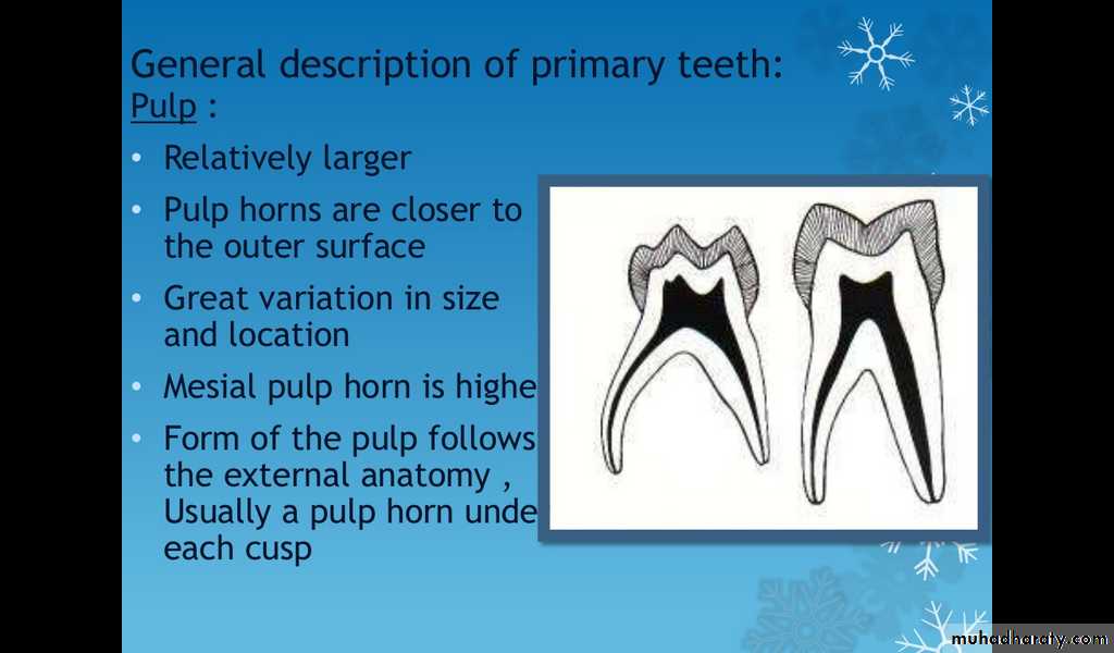 The ratio of pulpal tissue to coronal hard tissue is much greater in the primary teeth than in the permanent. The pulp champers in primary teeth follows the outline of the occlusal crown surface, thus a pulp horn is present under each cusp(mesial pulp horns are closer to the outer surface than distal pulp horns). Mandibular molars usually have larger pulp champers than maxillary molars.
