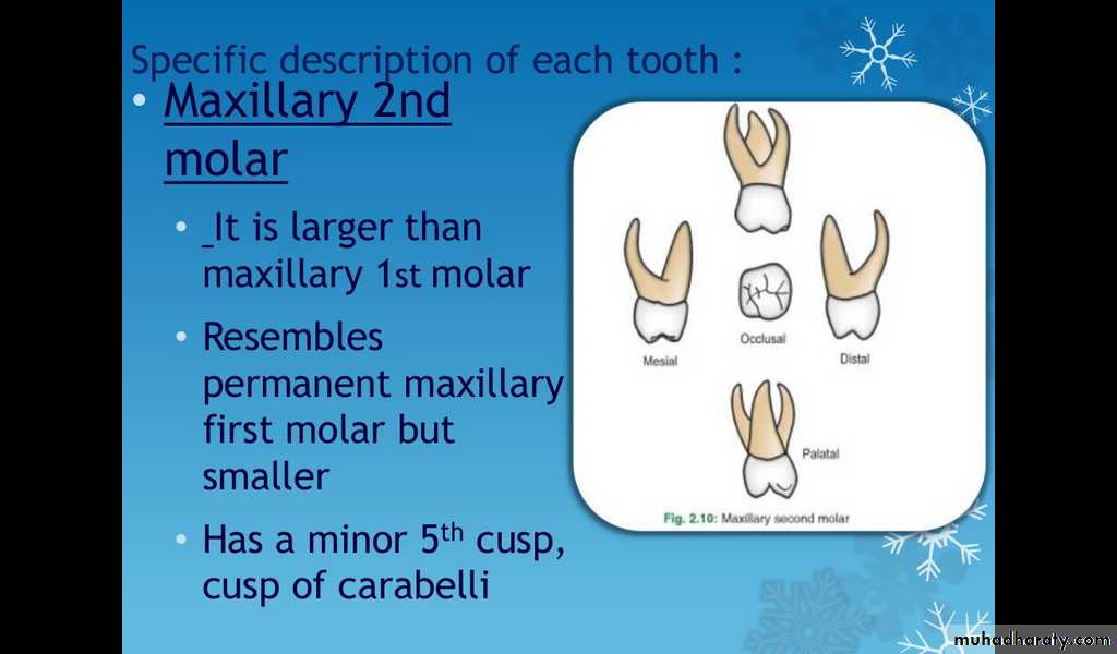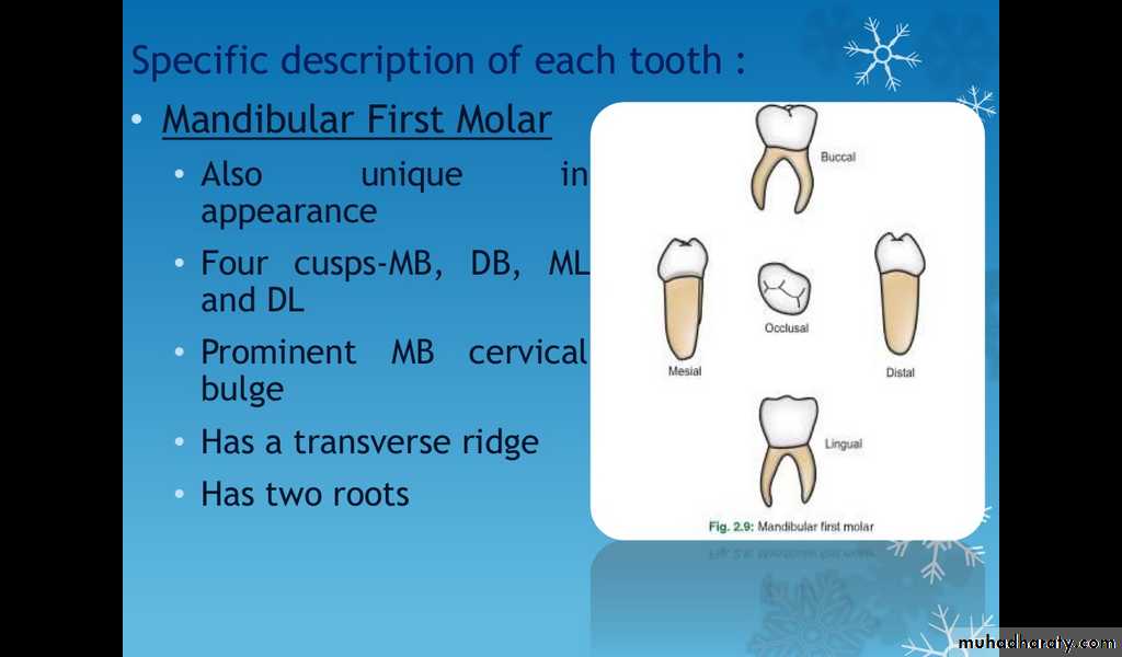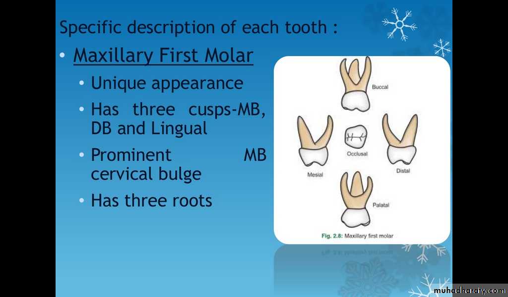 Unique appearanceHas three cusps-MB, DB and Lingual