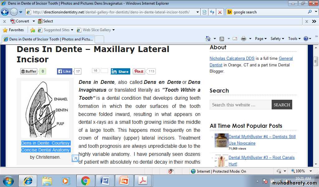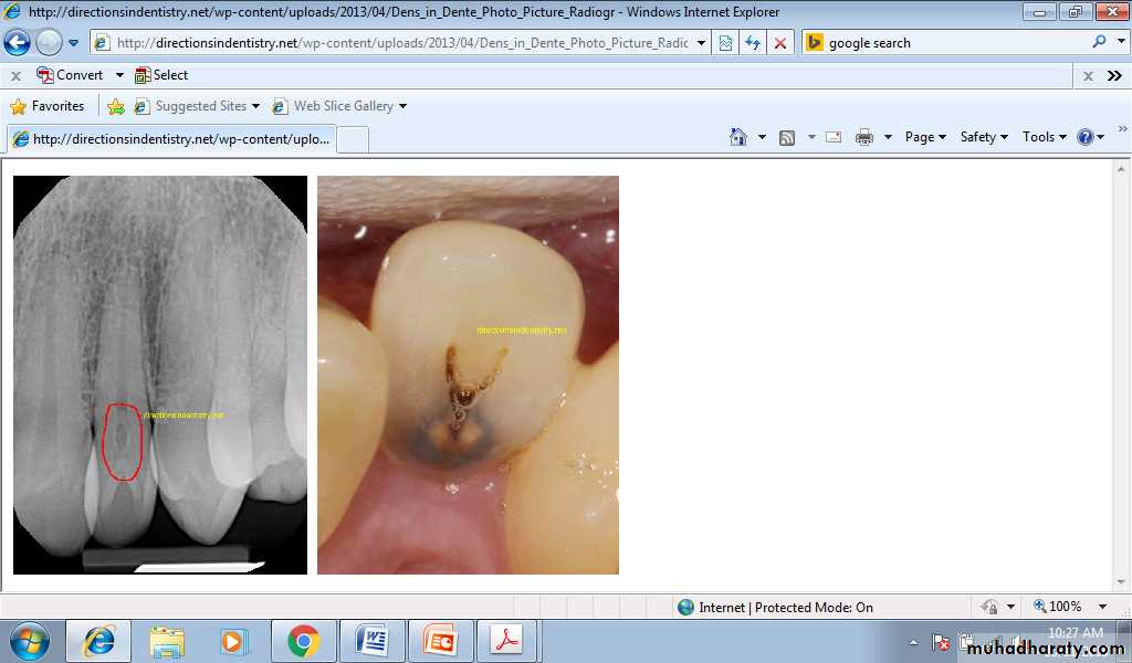 Dense invaginatus or dens in dent means tooth with in a tooth. This condition can occur in primary and permanent teeth. Dens in dente is most often seen in the permanent maxillary lateral incisors. The condition should be suspected whenever deep lingual pits are observed in maxillary permanent lateral incisors.Cause