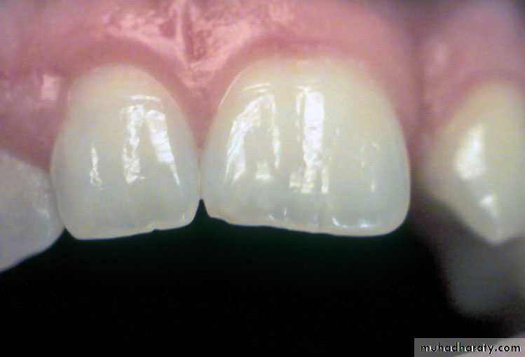 The color of the primary teeth being bluish white as compared to the yellows and greys color of the permanent teeth(this is because of the greater water content of the primary dentition than permanent).
