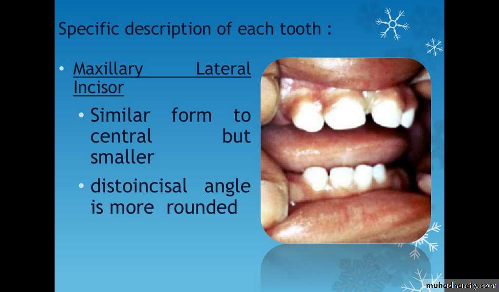 Incisal edge slopes toward distal and distoincisal angle more rounded