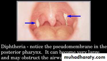 Respiratory tract form of diphtheria consist of pharyngotonsillar ,laryngotracheal ,nasal and combination of these forms.Pharyngotonsillar : sore throat, low grad fever, O/E mild pharyngeal erythema and localized exudate or grey-black adherent membrane, Attempt to remove the membrane result in bleeding