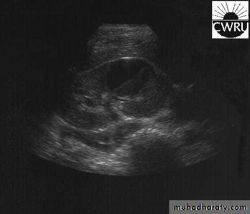 U/S: cystic cortical lesion with internal echoes.