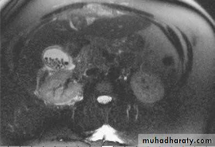 • within the gall bladder (arrowed).• Magnetic Resonance Cholangiopancreatograph: