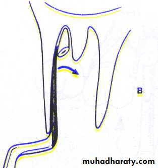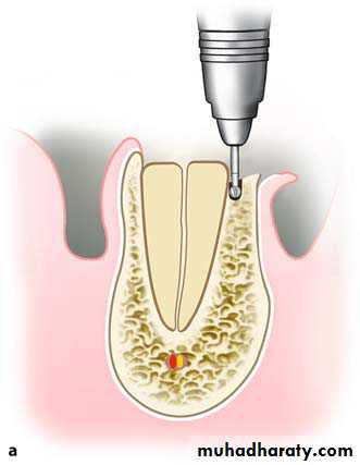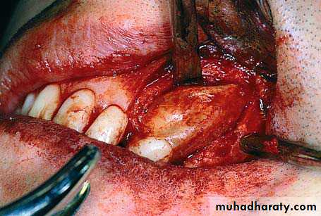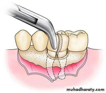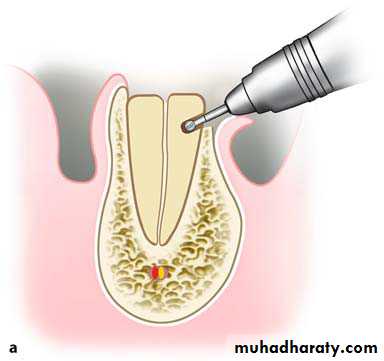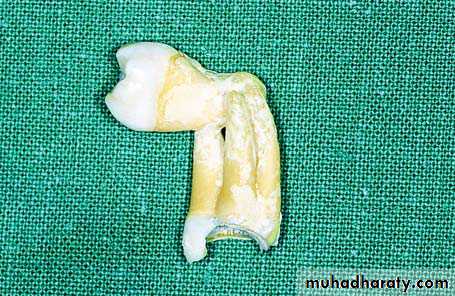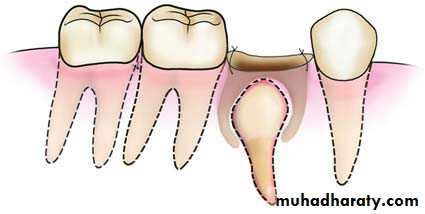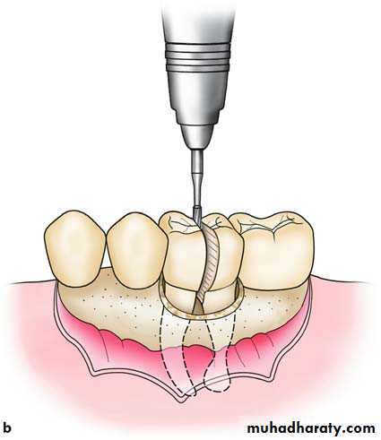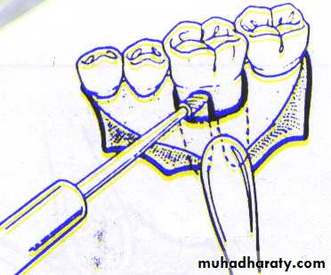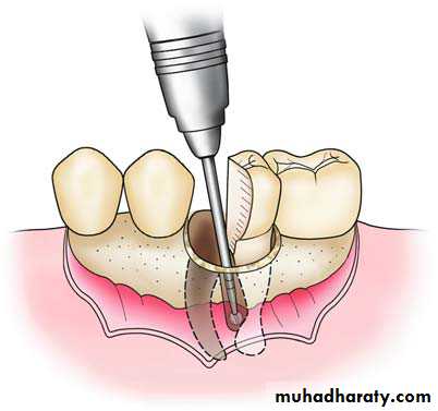 2- Envelope flap is reflected, part of the buccal plate is removed, and the tooth is sectioned buccolingually at the crown as far as the intraradicular bone3- Extraction of the normal part of the root then widening of the alveolus with a round bur, so that removal of the root is possible without fracturing the bulbous root tip. Extraction of the distal portion of the tooth using forceps after creating a pathway for removal