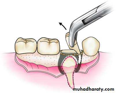 a large part of the buccal bone is removed using a round bur until the root is exposed .The root is then luxated using a straight elevator. The root is mobilized easily, using rotational movements with the elevator and applying a small amount of pressure outwards.
