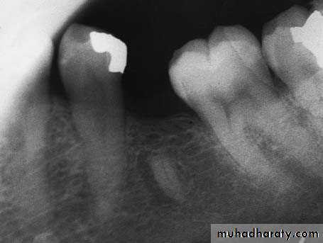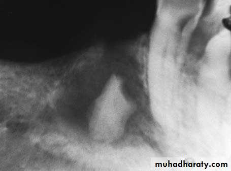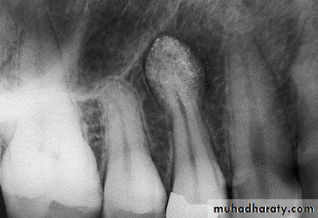 1- a mandibular molar with hypercementosis at the distal root tip.
