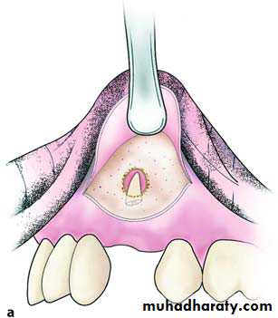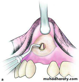 The root may also be removed though the window itself that was created on the buccal bone. A semilunar flap is created and complete or partial exposure of the root follows. The root is then removed from the bone deficit without difficulty, preferably using a narrow- angled elevator . This technique is usually used in cases of fractured small roots, which were not removed during the extraction procedure but remained in the socket for a long time and were eventually totally covered by bone.