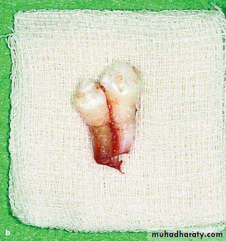1- Surgical Extraction of Teeth with Intact CrownWhen the extraction involves a multi-rooted maxillary tooth, an envelope flap is created and the buccal plate is removed using a round bur, as far as the root bifurcation. The two buccal roots are sectioned and the crown together with the palatal root is then removed The two other roots are then removed separately, using a straight elevator or root tip forceps.