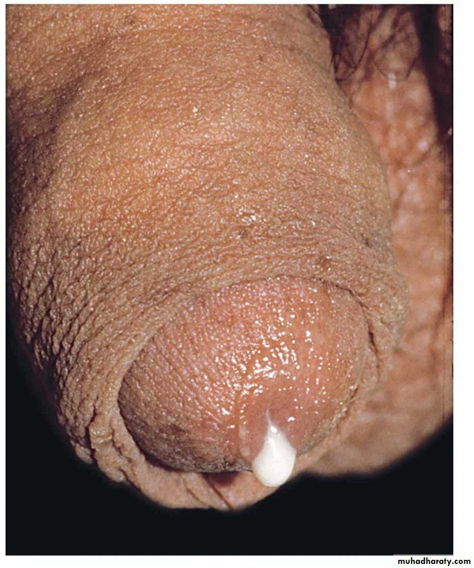 Gently milking the urethra from the base of the penis to the glans may exudes discharge from the urethral meatus.