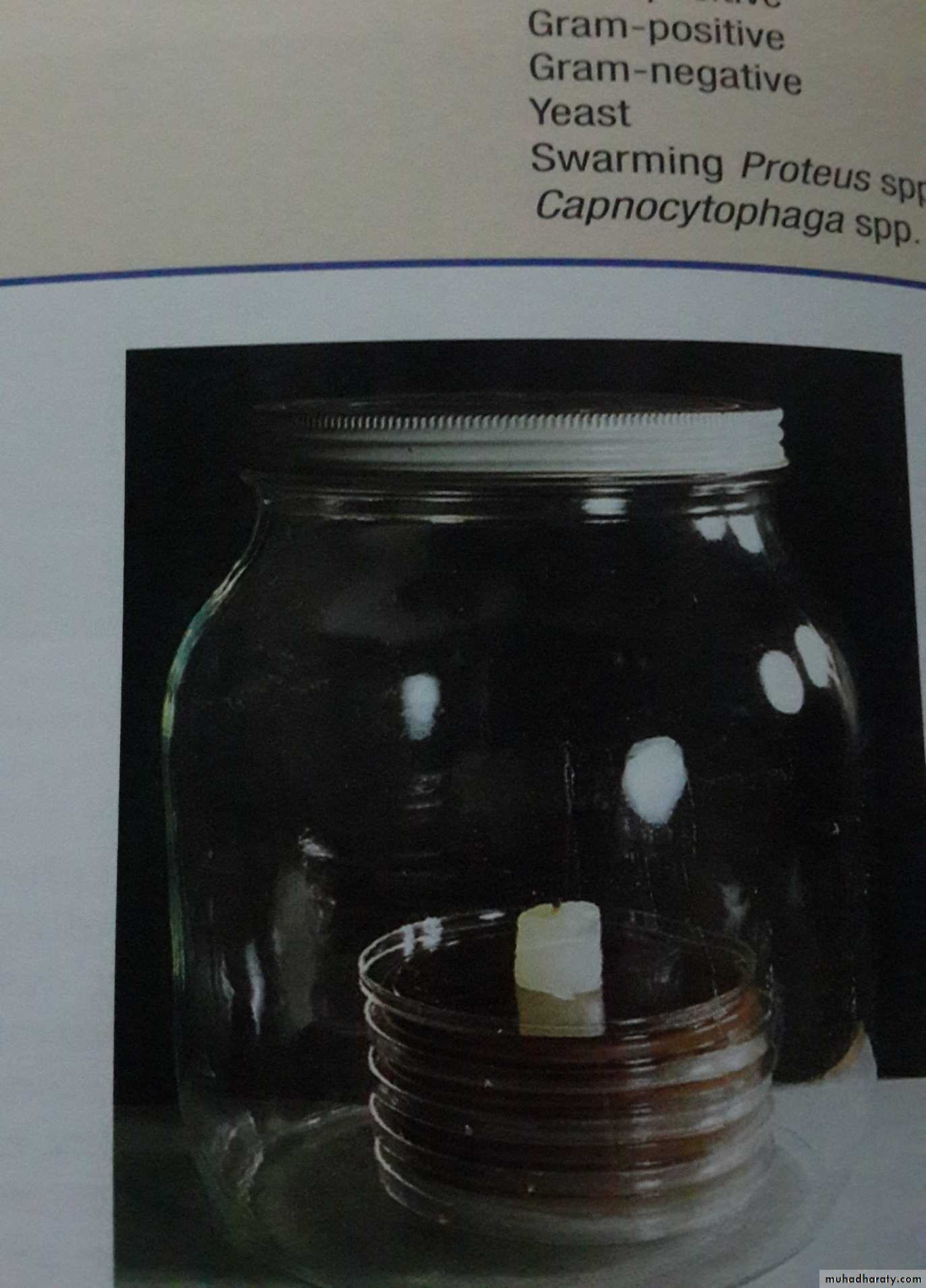 The culture is incubated 3-7 % CO2 (candle jar) at moist 35-37C for 24-72hr.