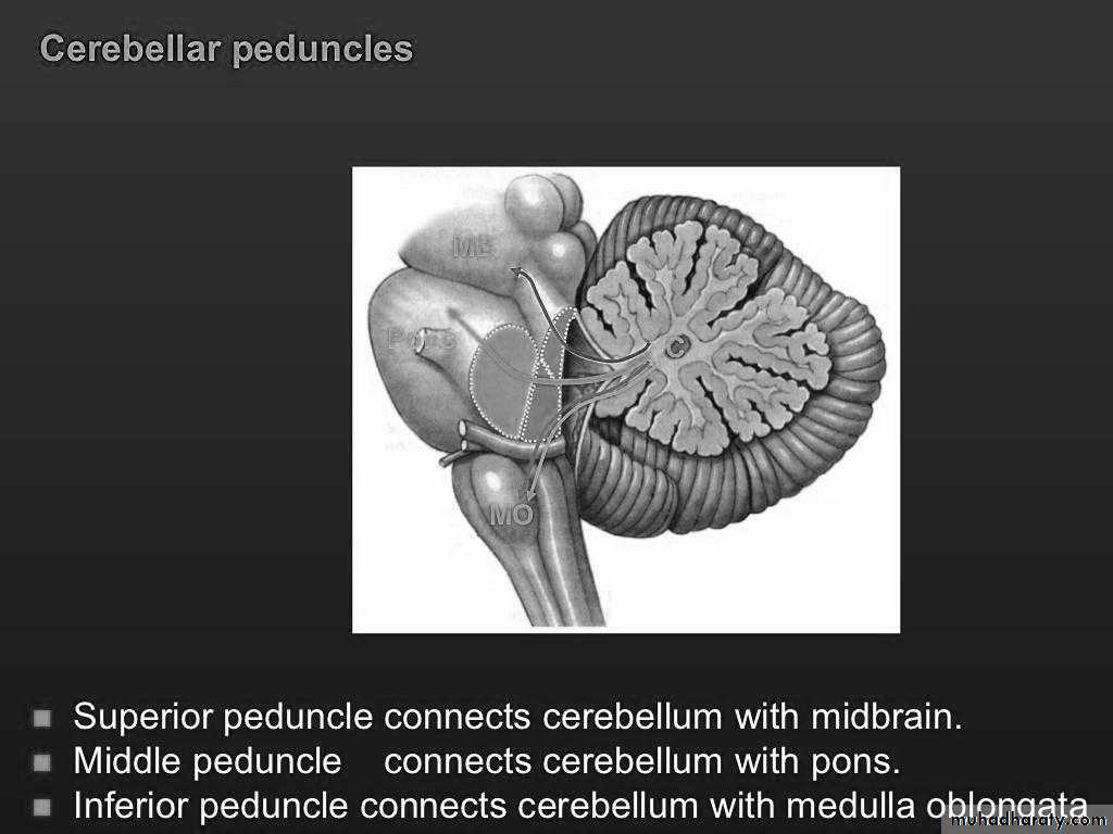 Middle peduncle connects cerebellum with ponsInferior peduncle connects cerebellum with medulla oblongata