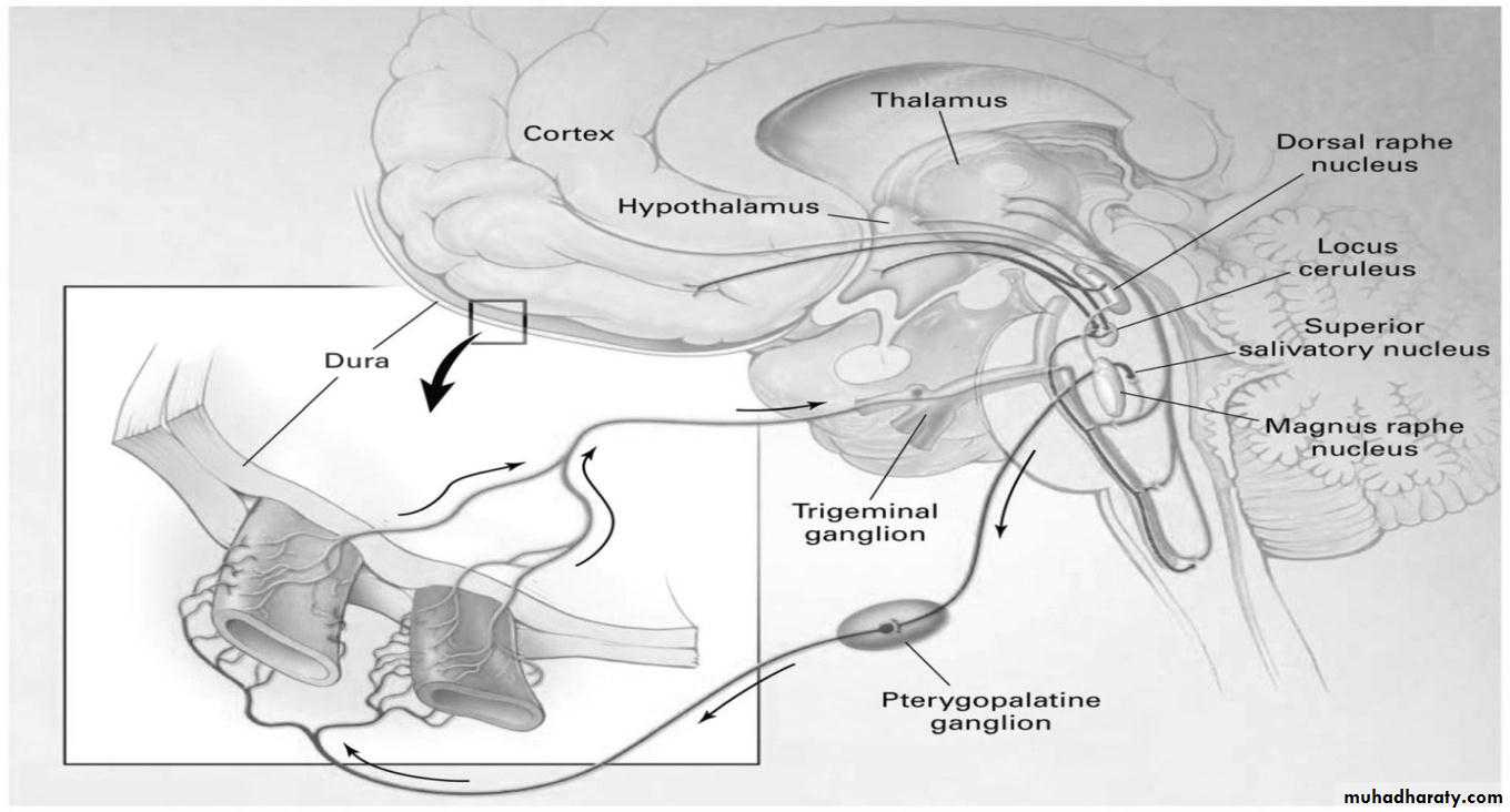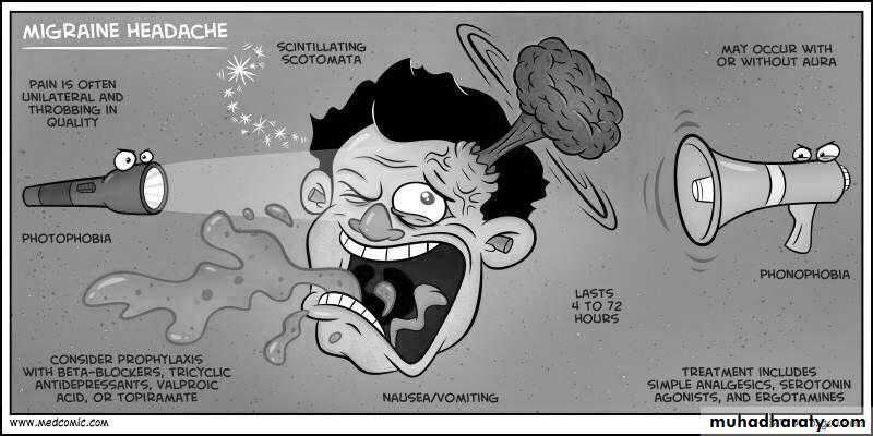 Migraine is generally an episodic headache often with sensitivity to light, sound or movement, nausea or vomiting accompanying the headache , and may occur with or without aura. While migraine is often hemicranial, it is bilateral in about 40% of adults, Two-thirds to three-fourths of cases of migraine occur in women; the onset is early in life more than 90% before age 40Migraine pathophysiology