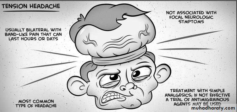 TENSION-TYPE HEADACHEThe term tension-type headache (TTH) is commonly used to describe a chronic head-pain syndrome characterized by bilateral tight, band like discomfort or pressure at the vertex. It is of constant character and generalised,but often radiates forwards from the occipital region. The pain typically builds slowly, fluctuates in severity, and may persist more or less continuously for many days. The headache may be episodic or chronic (present >15 days per month).