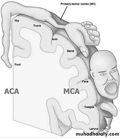 The picture above indicate the homunculus which is the representation of the body parts in the brain. Please note that the ACA supply the medial side of the brain which usually represents the lower limb while the MCA supply more lateral side of the brain and it represents the hand and face. This will allow us to localize the vessel involved by the history and examination only as in the case below.Case 1/