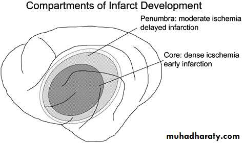 At the center of an infarct the damage is most severe but at the periphery collateral flow may allow continued delivery of blood, although at a lower rate. This zone may become dysfunctional secondary to electrical failure although not dead and is referred to as the ischemic penumbra, once blood flow falls below the threshold for the maintenance of electrical activity, neurological deficit develops. At this level of blood flow the neurons are still viable; if the blood flow increases again, function returns; however, if the blood flow falls further, irreversible cell death occur.Consensus exists that medications should be withheld unless the systolic blood pressure is >220 mm Hg or the diastolic blood pressure is >120 mm Hg in early days unless there is contraindication to keep high BP or we decide to give thrombolytic drug.
