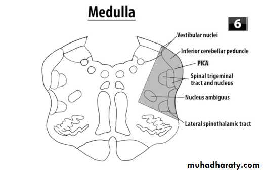 Cross signs (ipsilateral cranial nerve plus contralateral weakness or sensory loss) e.g.:Posterior inferior cerebellar artery occlusion (PICA): results in the lateral medullary (Wallenberg) syndrome. This syndrome varies in its presentation with the extent of infarction, but it can include ipsilateral cerebellar ataxia, Horner syndrome, facial sensory deficit and dysphagia; contralateral impaired pain and temperature. The motor system is characteristically spared because of its ventral location in the brainstem.