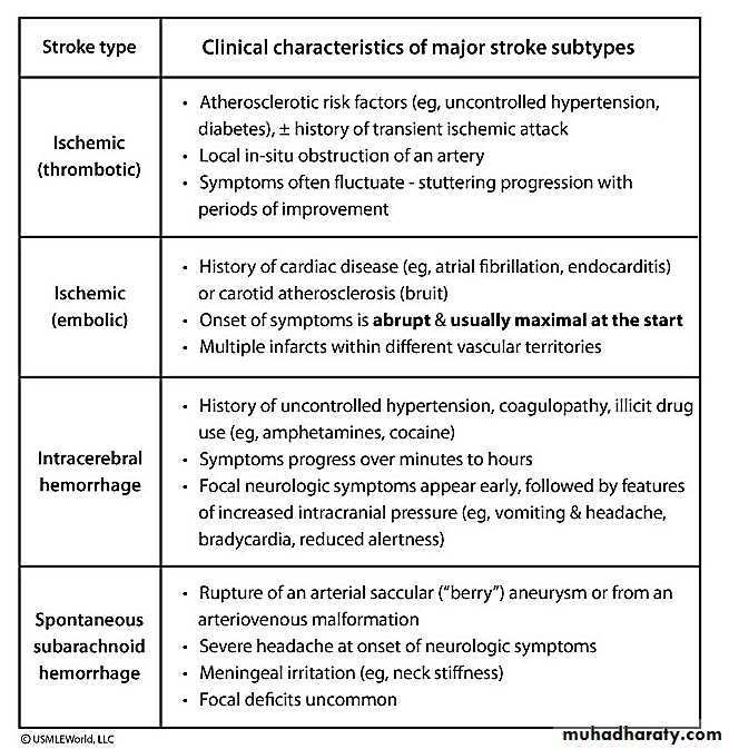 Haemorrhage is subdivided according to location into intracranial haemorrhage and subarachnoid haemorrhage, while infarction is caused by either embolic (Sudden) or thrombotic (gradual)