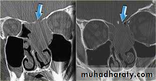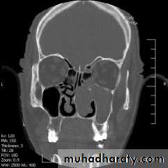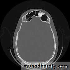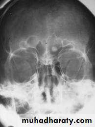 1-Osteoma: it is slowly growing tumor. It often occurs in young adult and mostly in the frontal sinuses. Usually they are asymptomatic and found incidentally by routine radiographs. When osteoma become large may cause headache and sometimes cause obstruction of frontonasal duct → mucocoele which may be secondarily infected → pyocoele. Also it may affect ethmoidal sinus causes broad nasal bridge.Diagnosis: by radiology.