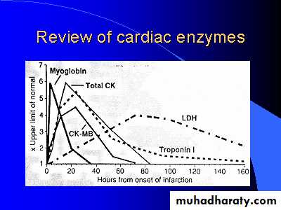 Released into the circulation from necrotic heart muscle.1-CK (creatine kinase) rises 4-8 hrs after onset of MI and normalize by 48-72 hrs,