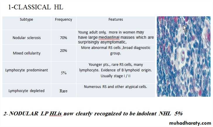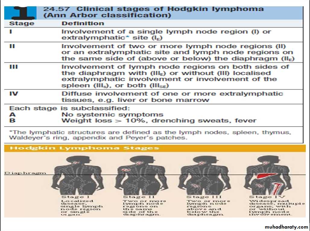 Clinical presentation1- most pt present with one or several enlarge painless LN. cervical, inguinaland axillary's nods are most frequently involved. Hepatosplenomegaly may bepresent2- 1/5-1/3 of pt with intermediate and high grade lymphoma present in extranodal site such as waldeyers ring, GIT, skin, salivary gland, bone.3- compression syndromes may occur, gut obstruction,ascites, superior vena caval obstruction and spinal cord compression.4 - BM involvement in high grade 10% and 50-60% in low grade.5- T cell lymphoma are usually first diagnosed in the skin lead to cutaneous T cell lymphoma (sezary syndrome), erthro-derma and circulating lymphoam cellswith hyper convoluted nuclei.**The same staging system is used for both HL and NHL, but NHL is morelikely to be stage III or IV at presentation.