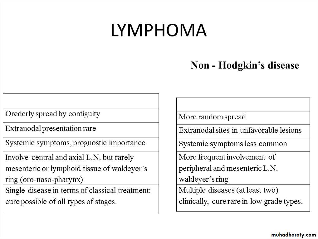 Most present as tumor Involving lymph nodes or otherlymphoid organs such as the spleen. But extra nodalpresentation may seen.1. Hodgkin’s Lymphoma.2.Non - Hodkin’s Lymphoma; Non-Hodgkin lymphomas areclassified as low- or high-grade tumours on the basis of theirproliferation rate.High-grade tumours divide rapidly, are typically present for amatter of weeks before diagnosis, and may be life-threatening.• Low-grade tumours divide slowly, may be present for manymonths before diagnosis, and typically behave in an indolentfashion.