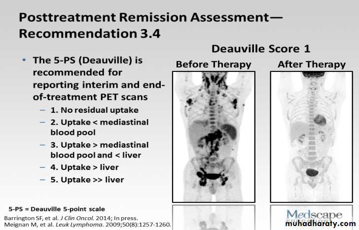 Management1-chemotherapy;The ABVD regimen (doxorubicin,vinblastine,bleomycin and dacarbazine)*cardiac and pulmonary toxicity, due to doxorubicinand bleomycin respectively.2-radiotherapy* The majority of HL patients are now treated withchemotherapy and adjunctive radiotherapy.* Early-stage patients usually includes additional treatment with radiotherapy to the involved lymph nodes after four courses of ABVD.* Advanced-stage disease are most commonly managed with chemotherapy alone. 6–8 cycles of ABVD.* Patients with disease which is resistant to therapy may be considered for autologous HSCT.* Treatment response is assessed clinically and by repeat CT and newerscanning modalities such as positron emission tomography (PET(