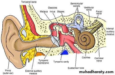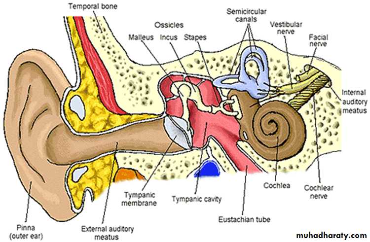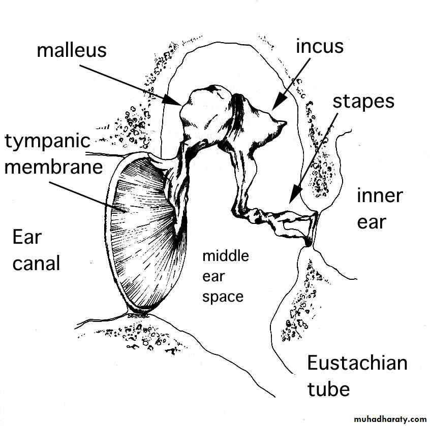 Lies within temporal bone & connects to ear drum (tympanic memb)