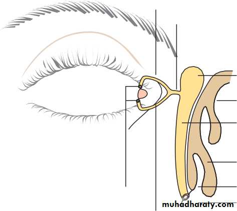 • sympathetic supply is damaged (as in Horner’s syndrome) a slight ptosis results.• The margin of the eyelid is the site of the mucocutaneous junction. It contains the openings of the meibomian oil glands which are located in the tarsal plate. These secrete the lipid component of the tear film. Medially, on the upper and lower lids, two small puncta form the initial part of the lacrimal drainage system