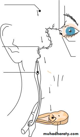 • THE LACRIMAL DRAINAGE SYSTEM (Fig. 1.4)• Tears drain into the upper and lower puncta and then into the lacrimal sac via the upper and lower canaliculi. They form a common canaliculus before entering the lacrimal sac. The nasolacrimal duct passes from the sac to the nose. Failure of the distal part of the nasolacrimal duct to fully canalize at birth is the usual cause of a watering, sticky eye in a baby. Tear drainage is an active process. Each blink of the lids helps to pump tears through the system.