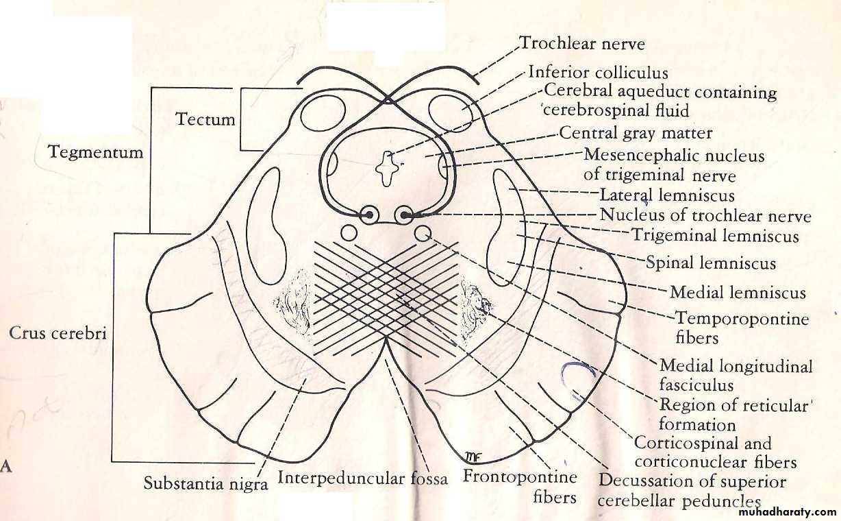 Is continuous below with the tegmental part of the Pons, the part of the tegmentum at the level +of the superior colliculus contains red nucleus (an important extrapyramidal centre), While at the level of inferior colliculus the tegmentum receives the decussation of the 2 superior cerebellar peduncles.The nuclei in the midbrain