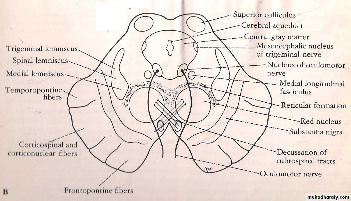 • Cortico-spinal fibers: - occupy the middle 3/5th of the crus cerebri.