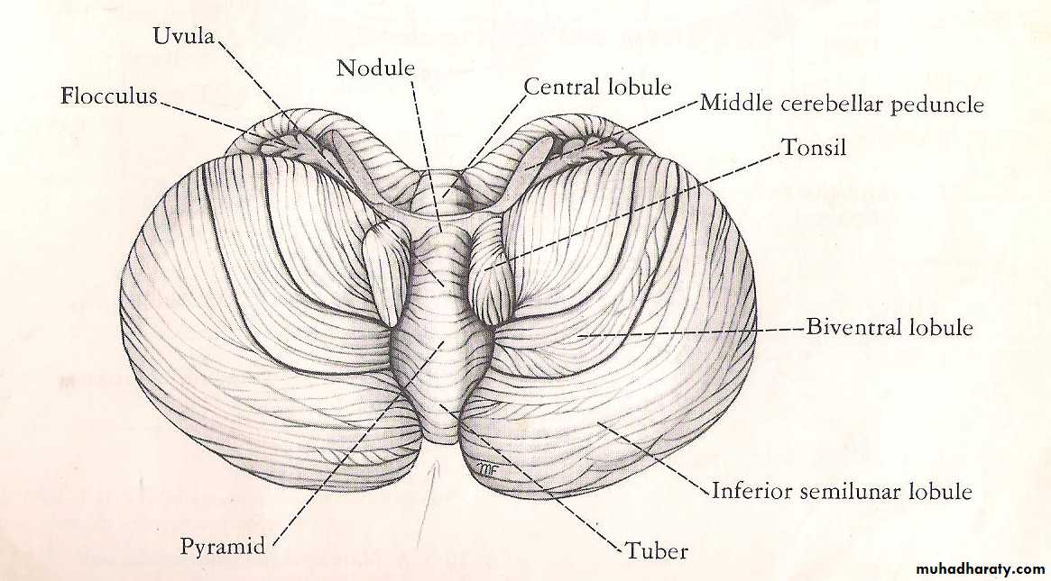 It lies in the posterior cranial fossa, behind the Pons and medulla oblongata and encloses with them the 4th ventricle. It has two surfaces (sup. and inf.), two notches (the ant. and pos. – the anterior one receives the back of the brain stem, while the posterior receives the falx cerebelli). It consist of two hemispheres connected by narrow median vermis, the part of vermis seen from above is the superior vermis, while that seen from inferior surface is the inferior vermis.The outer cortex grey mater is highly folded with numerous transversely running fissures, the part of cortex between the fissures are called the folia of cerebellum.