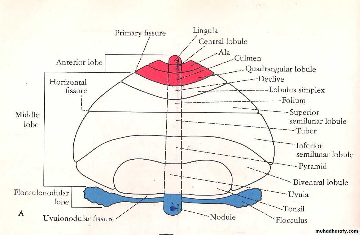 • Archi-cerebellum: - include flocculo-nodular lobe and the lingula, related to vestibular apparatus.• Paleo-cerebellum : is the anterior lobe minus the lingula and is connected to the spinal cord