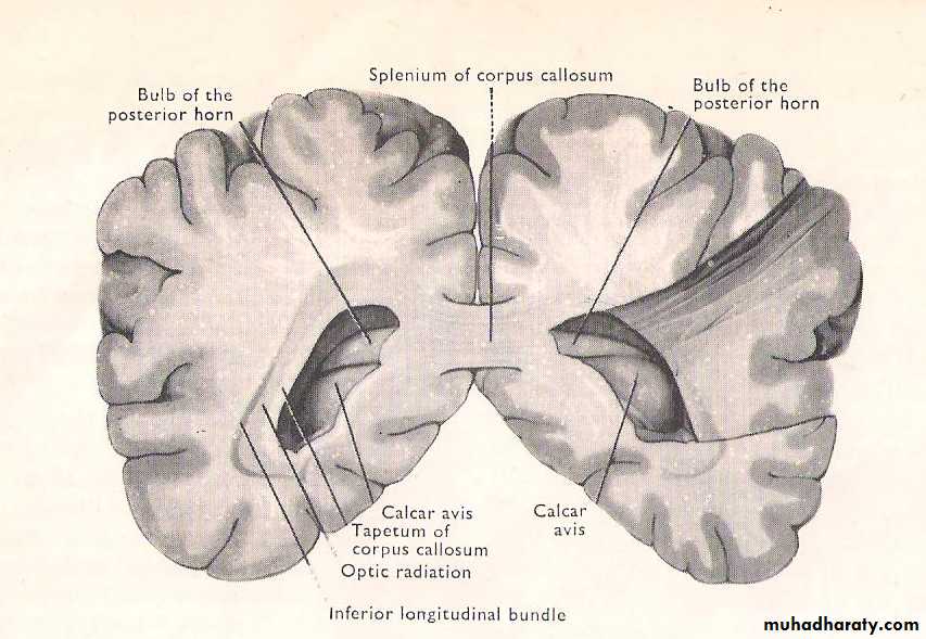 • Superior one is The Bulb of the posterior horn is caused by the splenial fibers of corpus callosum (forceps major) passing posteriorly into the occipital lobe.