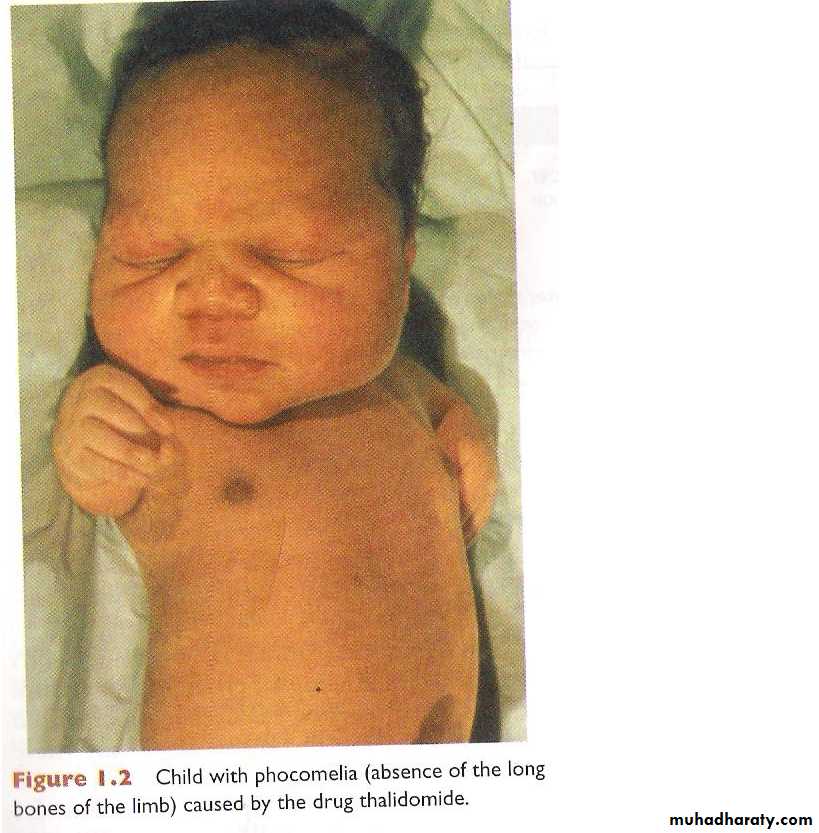 Thalidomide is strongly associated with congenital anomalies in the growing fetus & characterized by maily Gross deformities of long bones ( Amelia or meromelia),intestinal atresia and congenital heart defects.
