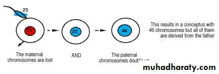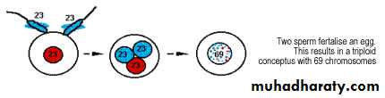 Are genetically biparental ,Usually with a triploid karyotype and arise due to two sperm fertilize an ovum or reduplication of paternal sperm haploid set and having 2 set of chromosome from paternal origin and one from maternal origin 69XXX, 69XXY, 69XYY.