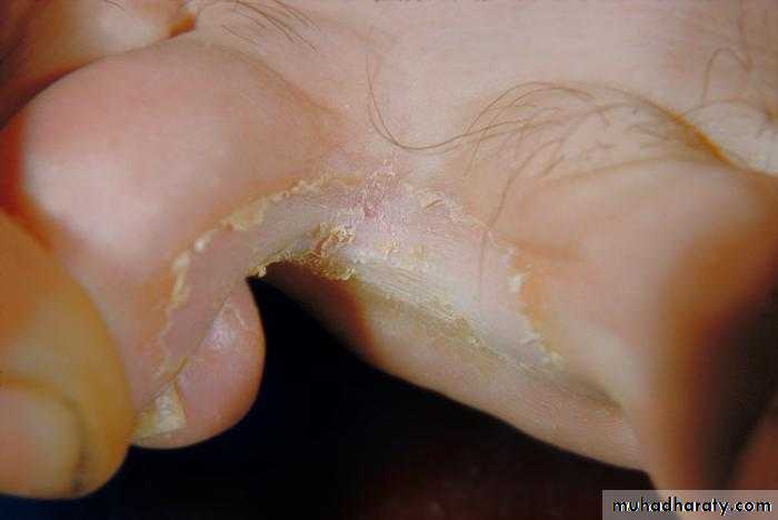 * swimming pools, occlusive footwear.* clinically: interdigital scaling