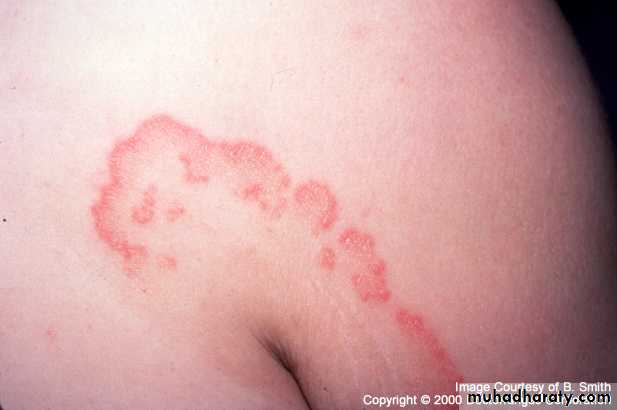 Erythematous scaly plaque, grow peripherally and clear centrally annular configuration=active border