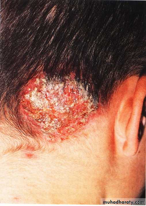 T. capitis: patchy hair loss with inflamm.